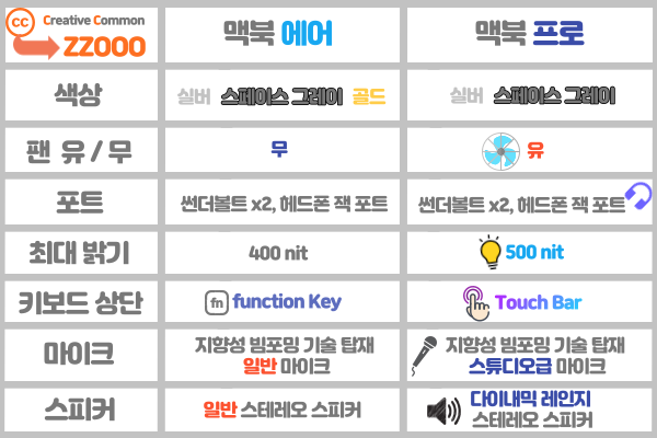 맥북 에어 vs 맥북 프로 간단한 스펙 비교