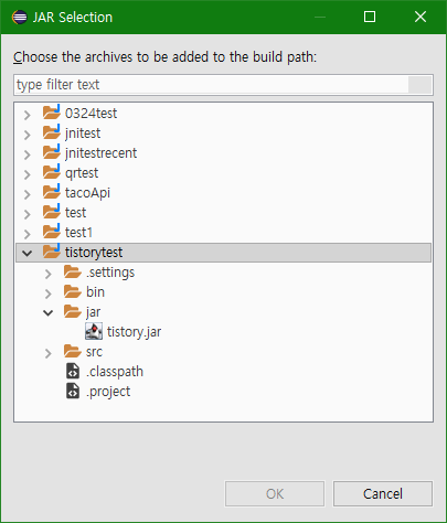 그리고 우리가 생성한 jar 폴더에 넣어놓았던 .jar파일을 클릭 후 OK를 눌러줍니다.
