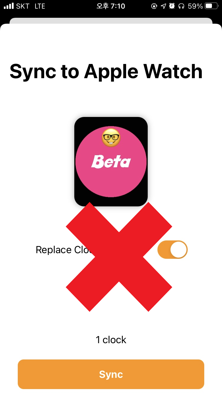 정상적으로 잘 실행하셨다면 워치에서 Clockology를 실행시켰을 때 워치에 베타 화면이 나옵니다.