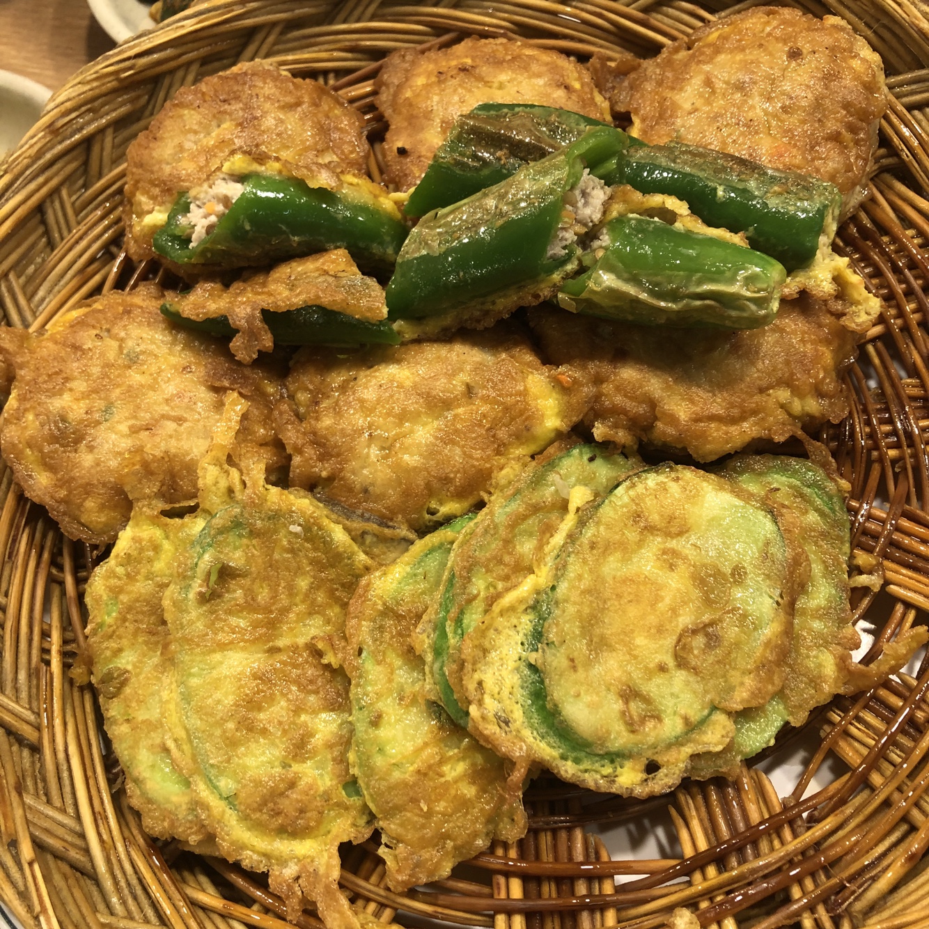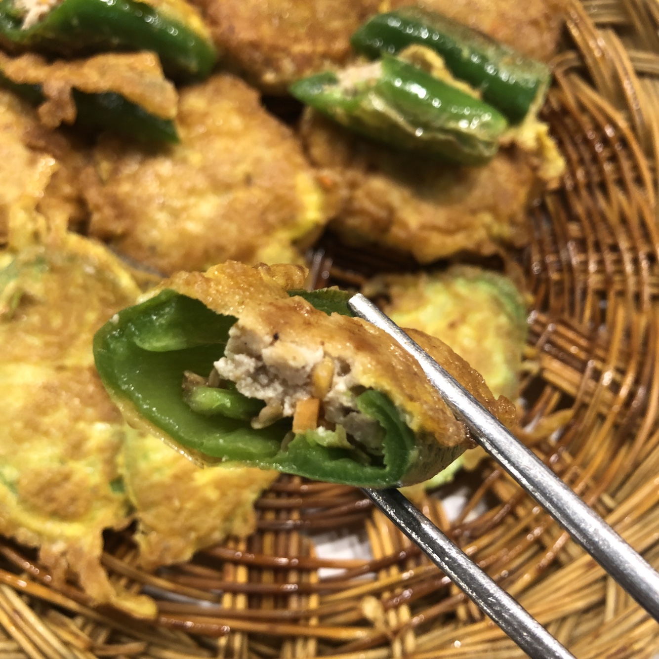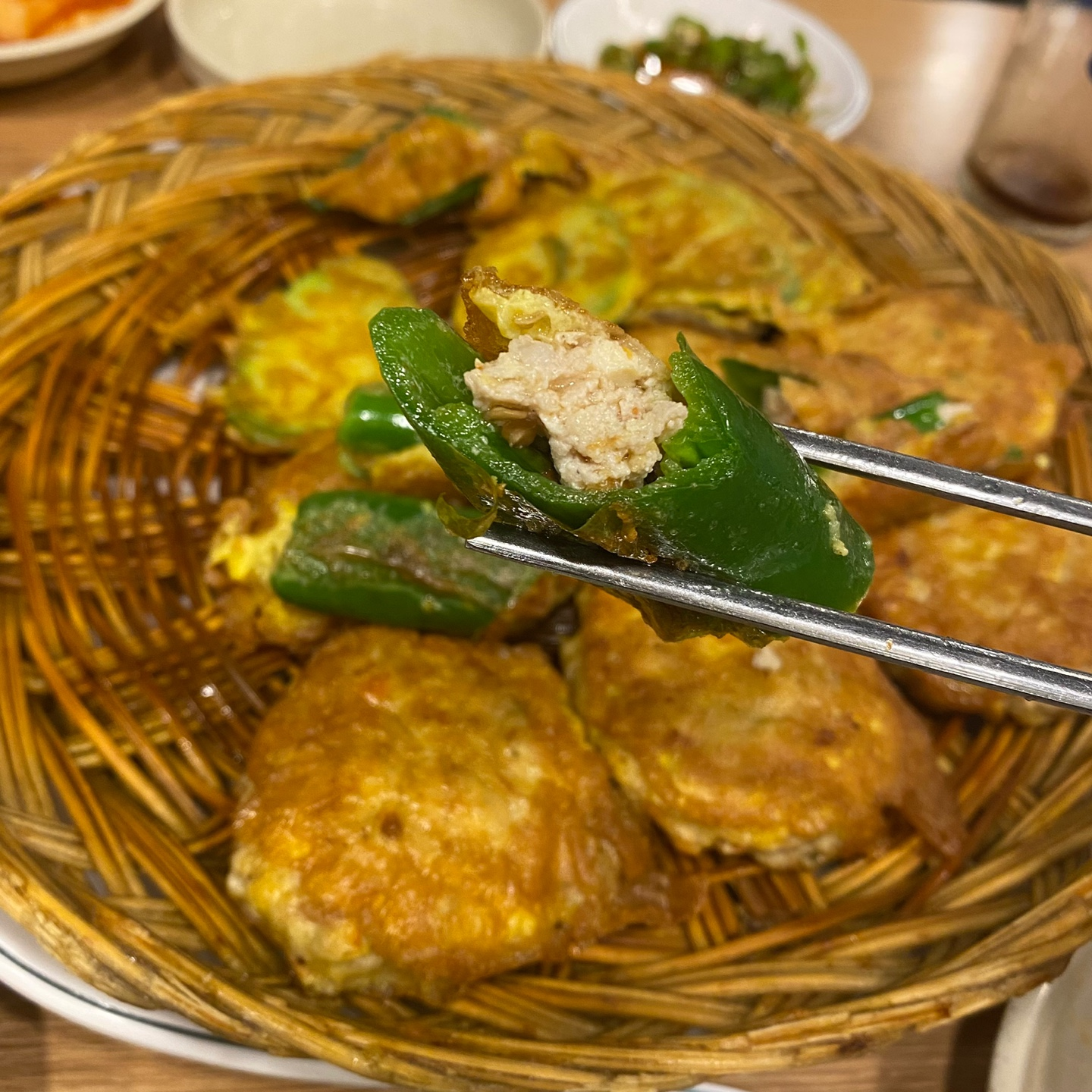고추 전도 깻잎전과 마찬가지로 속이 고기 반죽으로 채워져 있습니다.