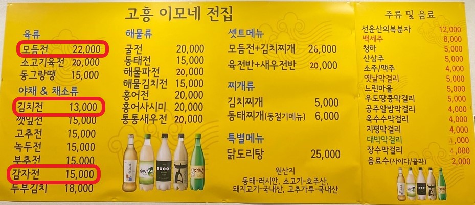기존 김치전은 2장에 13,000원 , 감자전 3장에 15,000원입니다.