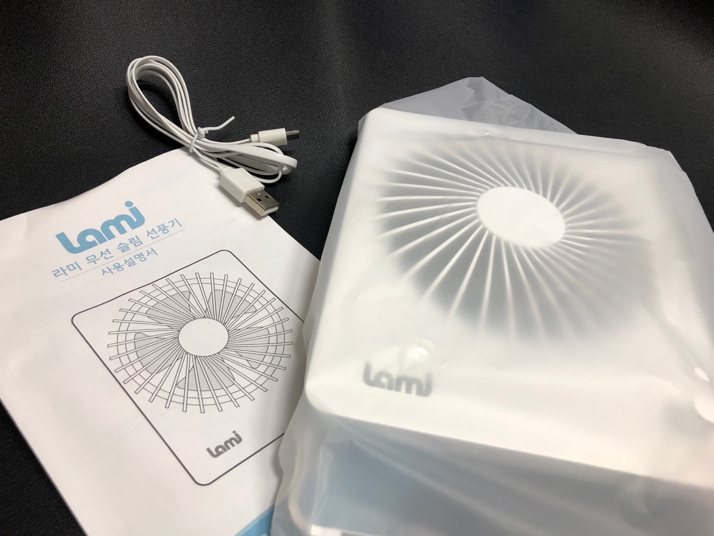 제품 구성은 설명서, 충전 케이블, 선풍기 본체로 총 3가지입니다.
