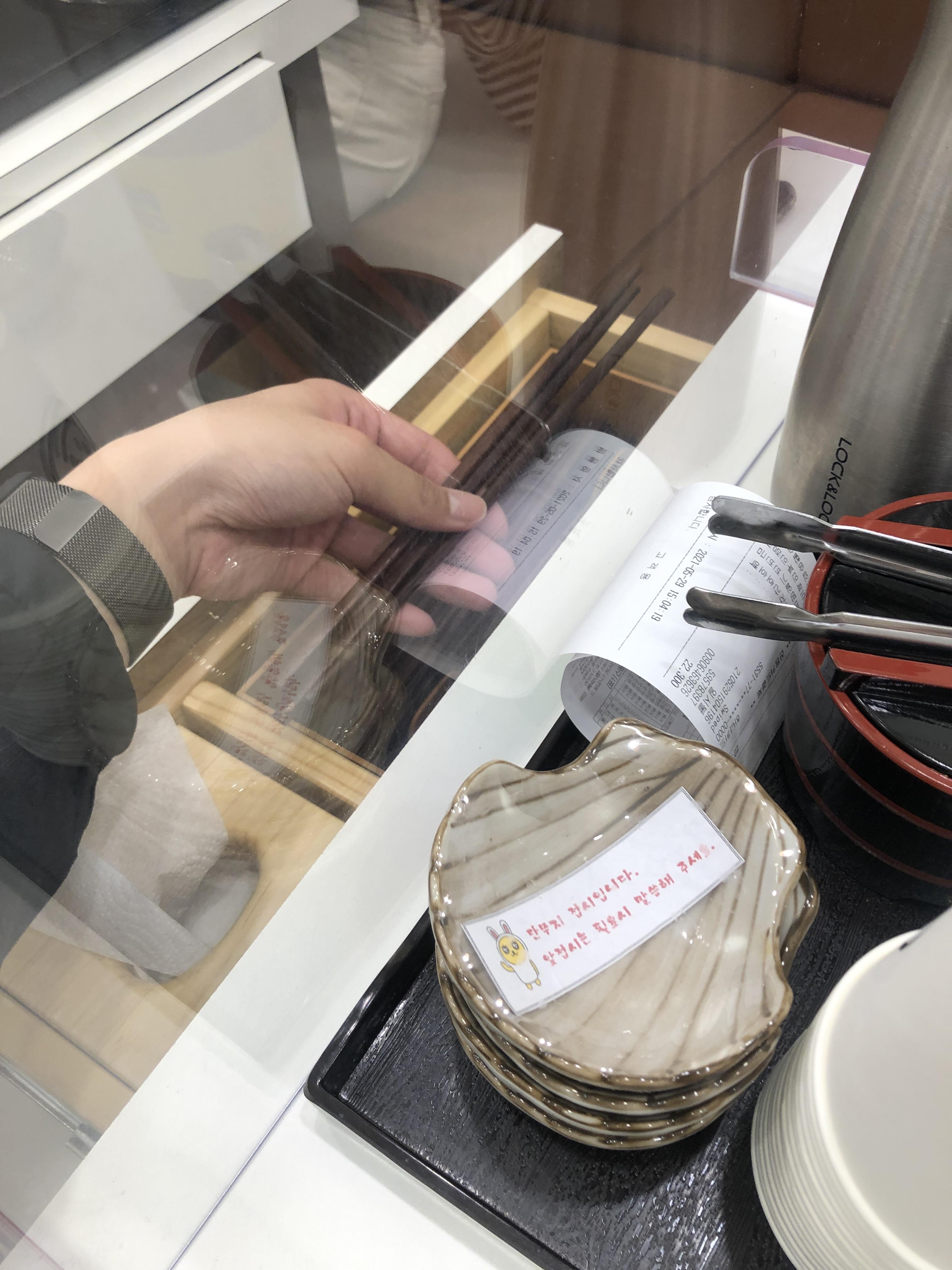 모든 식탁의 수저통 방향을 일원화시킨 걸까 ??? 싶었지만 왼쪽 테이블 보시면 수저통이 오른쪽을 향해있죠?