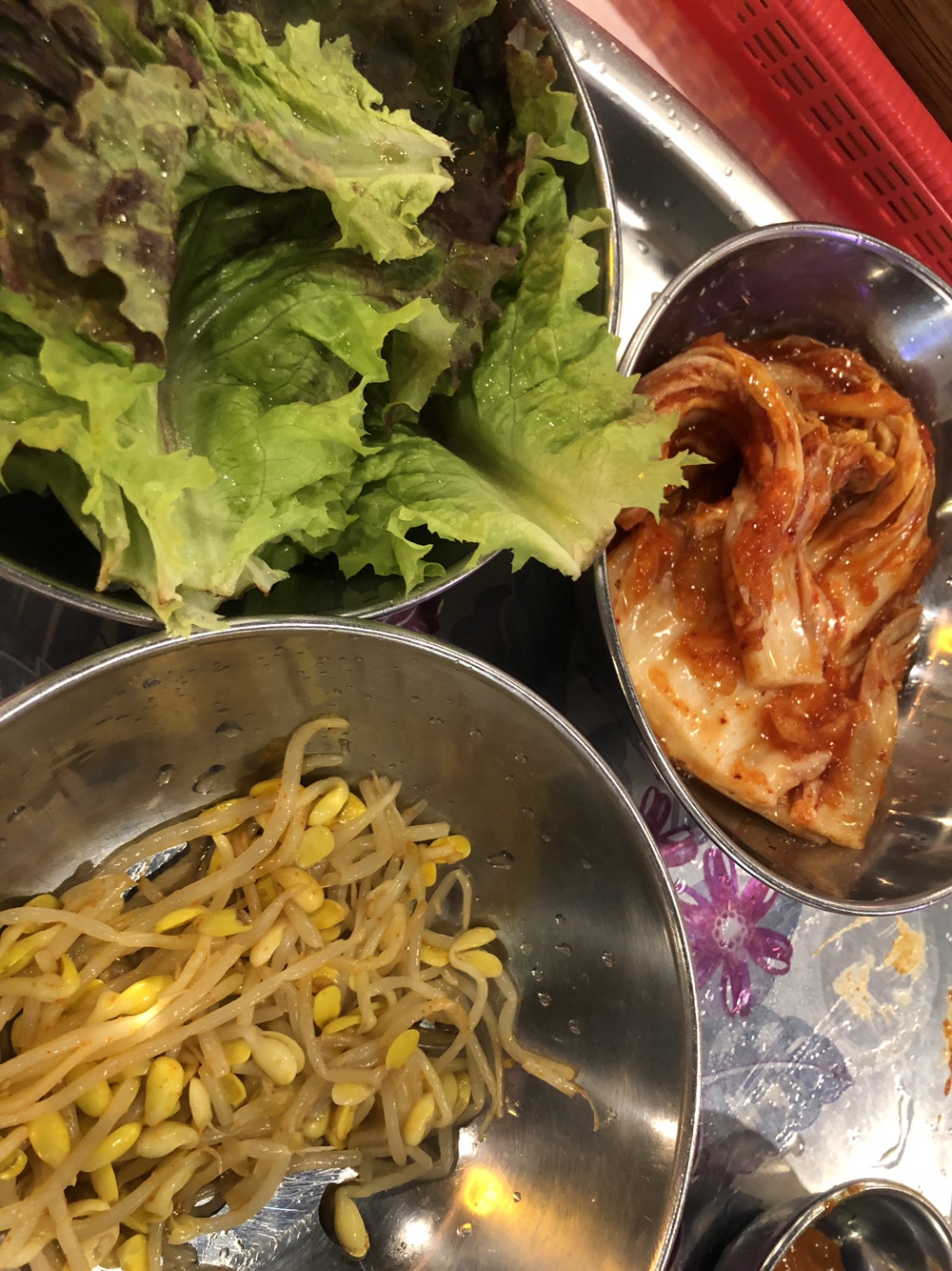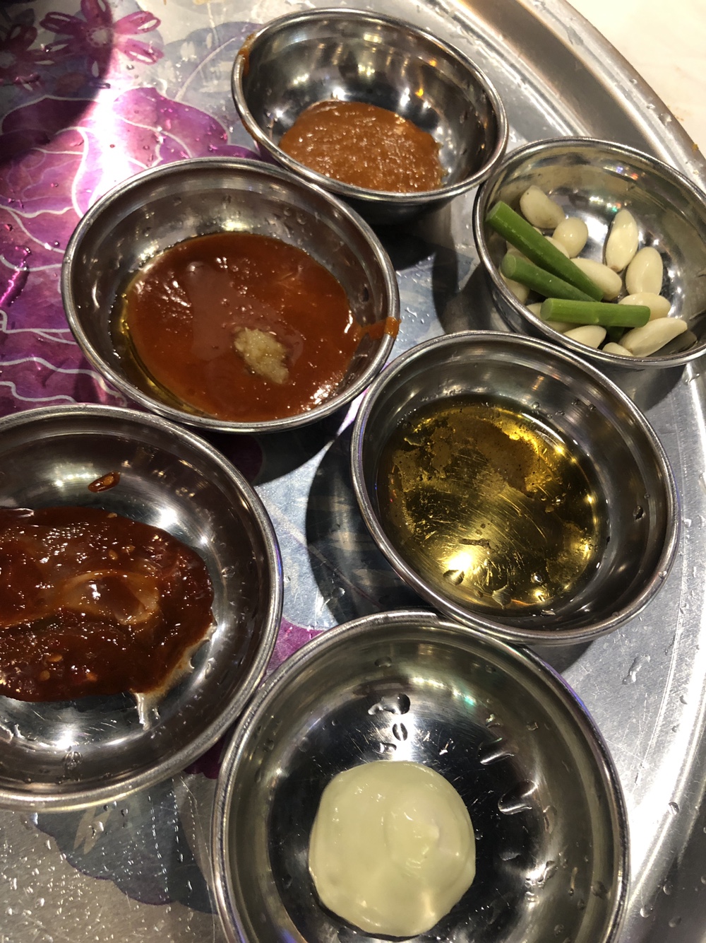 쌈장, 참기름고추장, 어리굴젓, 마늘쫑, 마늘, 기름장, 와사마요, 쌈채소, 김치, 콩나물