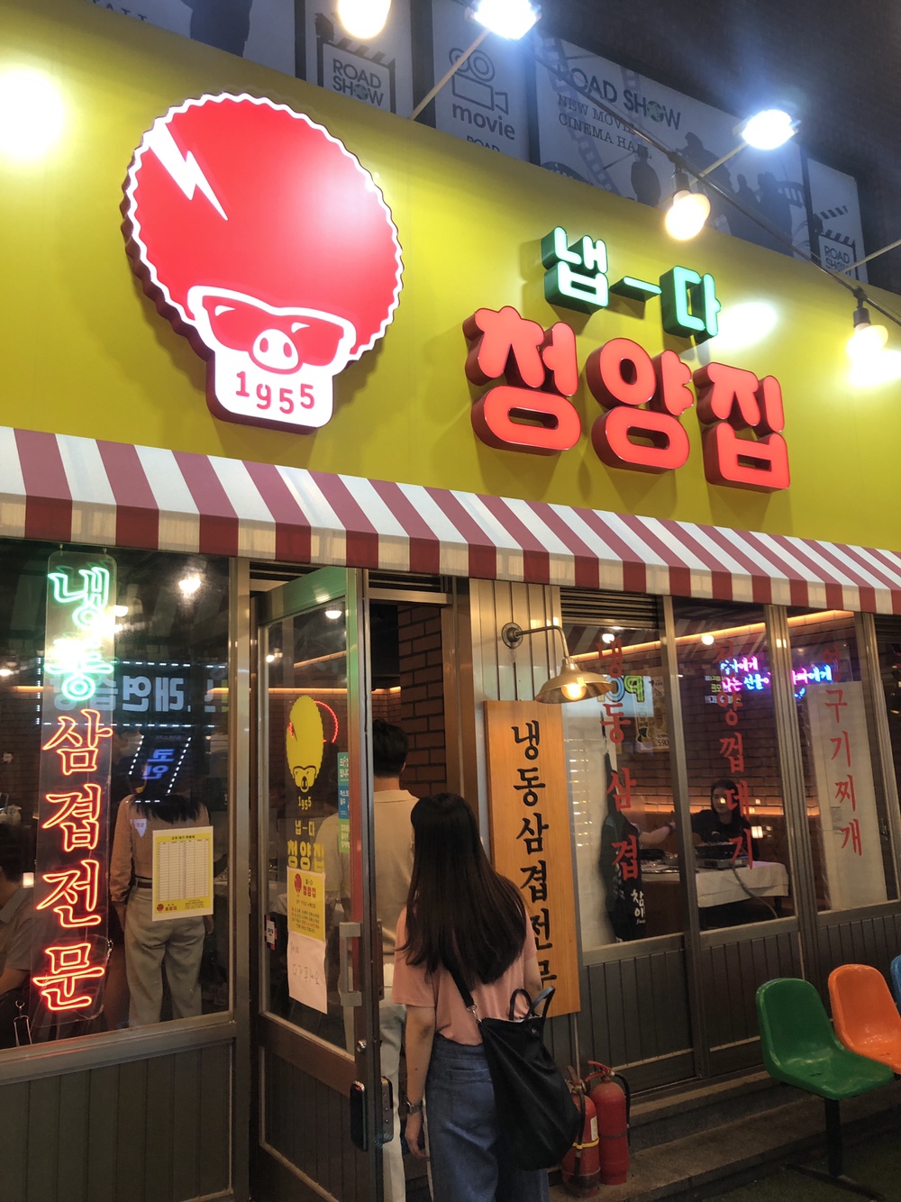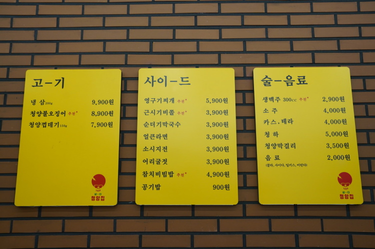 매장 외부에서 보이는 간판은 강렬한 노란 배경에 빨간색의 데프콘? 과 함께 청양집이라고 써져있네요.