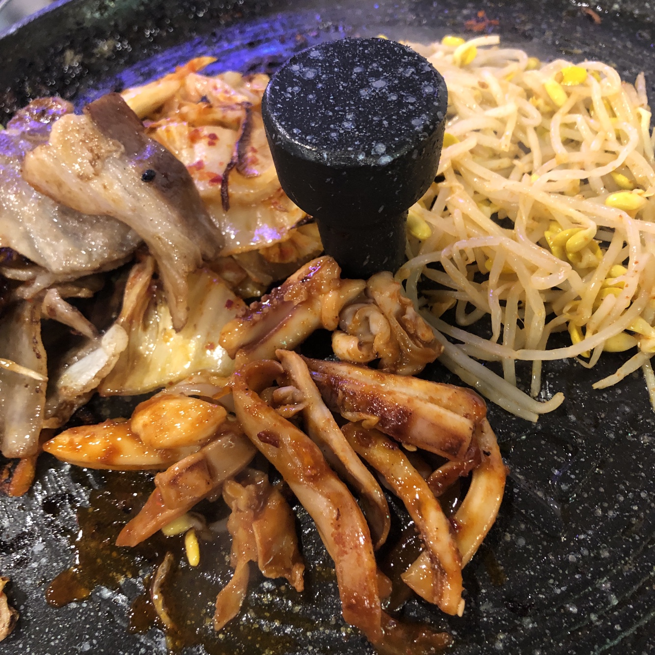 잘 구워진 고기에 볶은 청양불오징어, 치즈, 콩나물을 곁들여 먹어보았습니다.