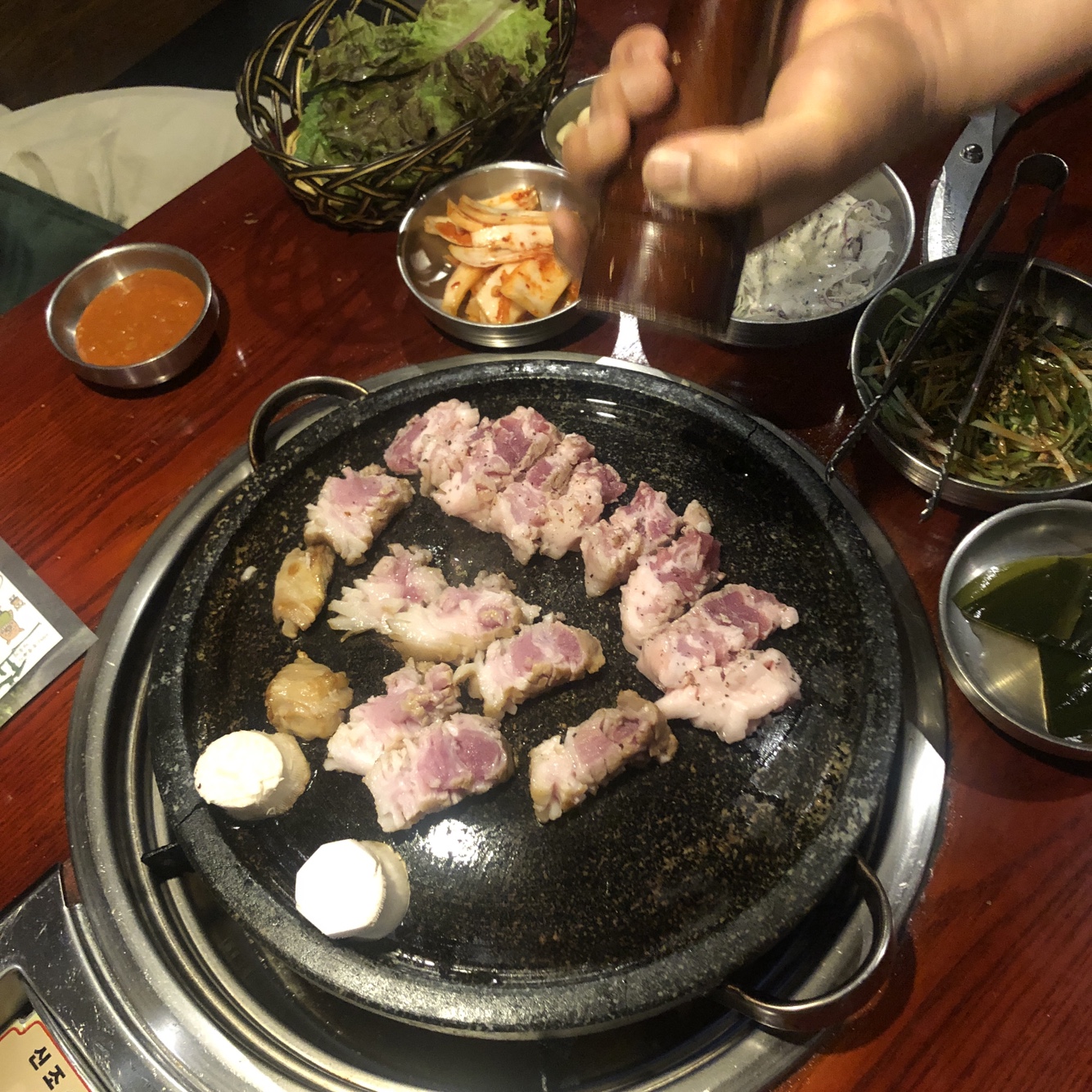 매장 내 테이블이 만석임에도 불구하고, 고기를 잘라주시고 후추를 뿌린 후 김치와 마늘도 구워주셨습니다.