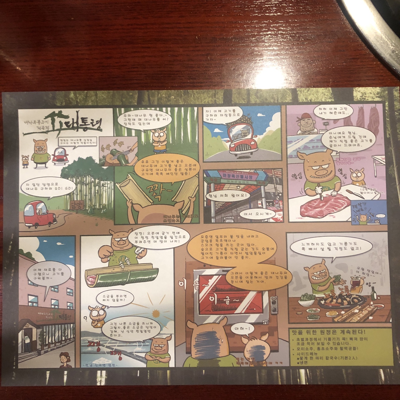 ( 대통령 삼겹살이 만들어지는 과정을 만화로 만들어놓은 식기 받침 종이라고 보시면 되겠습니다. )