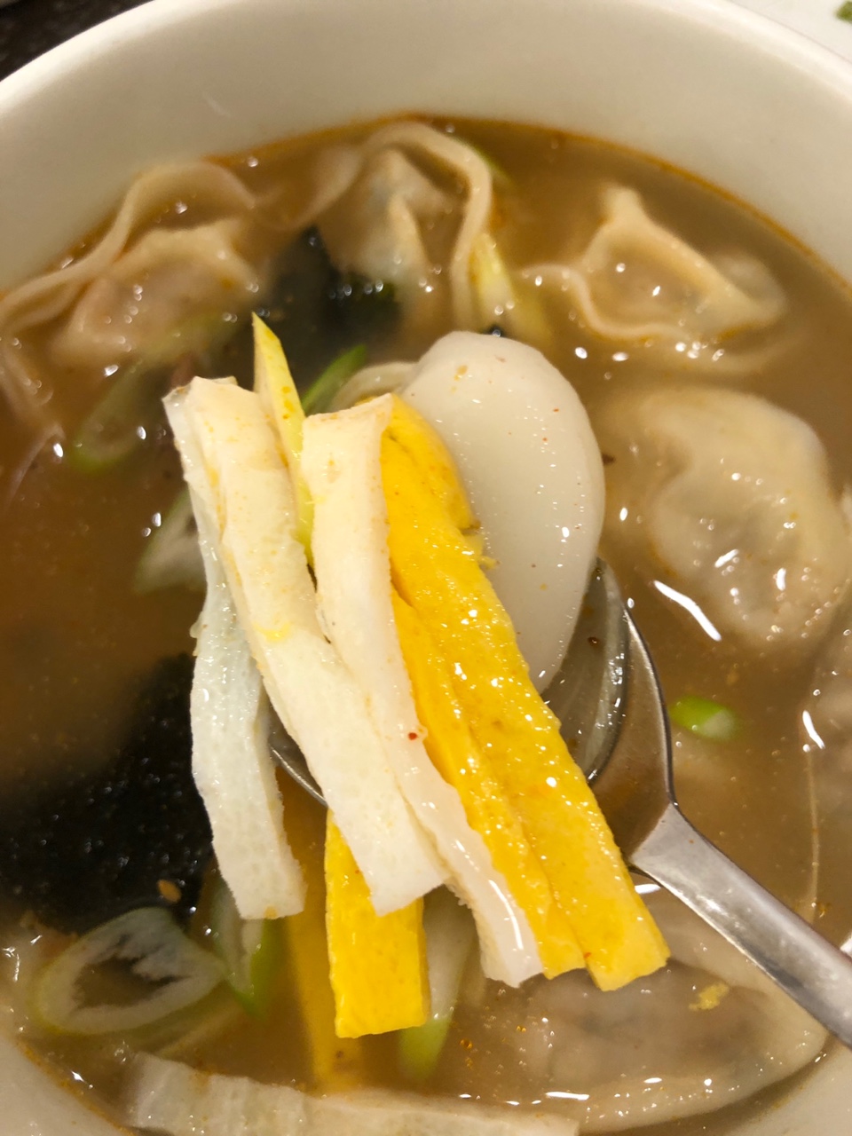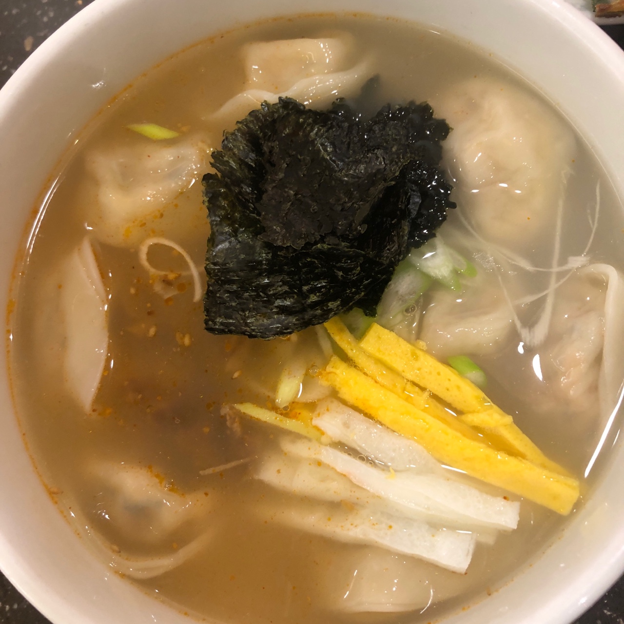 투박하게 잘라놓은 김가루와 흰자, 노른자 지단과 손만두 여러 개가 들어가 있습니다.