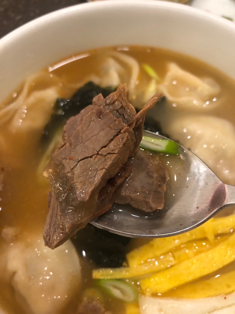만두국 속에 있는 내용물들입니다. 양념된 고기가 풀어지면서 국물의 색깔이 나오는 것입니다.